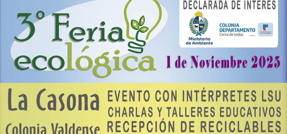 Colonia Valdense será sede de la tercera edición de la Feria Ecológica, un evento gratuito y abierto a toda la comunidad, que se llevará a cabo en “La Casona” de 15:00 a 20:00 horas. Este encuentro, que promueve la conciencia ambiental y el consumo responsable, cuenta con el apoyo de la Intendencia de Colonia a través de la Unidad Pymes y su Programa Colonia Está de Ferias. Además, ha sido declarada de interés departamental por la Intendencia de Colonia.
