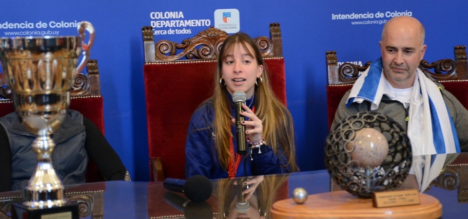 Familiares, amigos y vecinos de Colonia recibieron en el Salón de Actos del Palacio de Gobierno Departamental a Valentina Pérez, joven coloniense recientemente consagrada en Francia como Campeona Mundial en Tiro de Precisión y Vice Campeona en Parejas Mixtas, en el Campeonato Mundial Femenino y Mixto de Bochas.