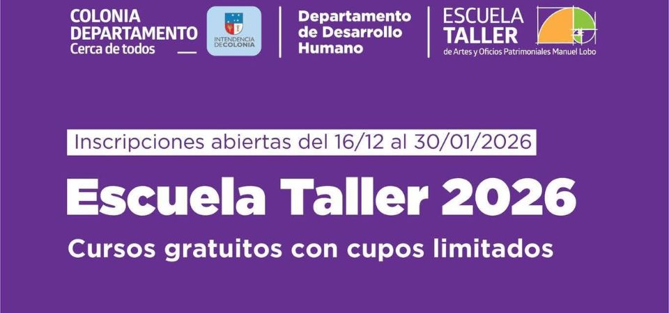 La Escuela Taller de Artes y Oficios Patrimoniales “Manuel Lobo”, dependiente del Departamento de Desarrollo Humano de la Intendencia de Colonia, recuerda que hasta el 30 de enero están abiertas las inscripciones para los Cursos 2026 de esta institución, tanto en Colonia como en Juan Lacaze y Carmelo, para jóvenes y adultos de todo el departamento.