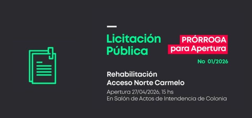 La Intendencia de Colonia por Resolución N° 476/2026 del Departamento Ejecutivo dispone PRORROGAR la Licitación Pública N° 01/2026 para la “Rehabilitación Acceso Norte Carmelo”.